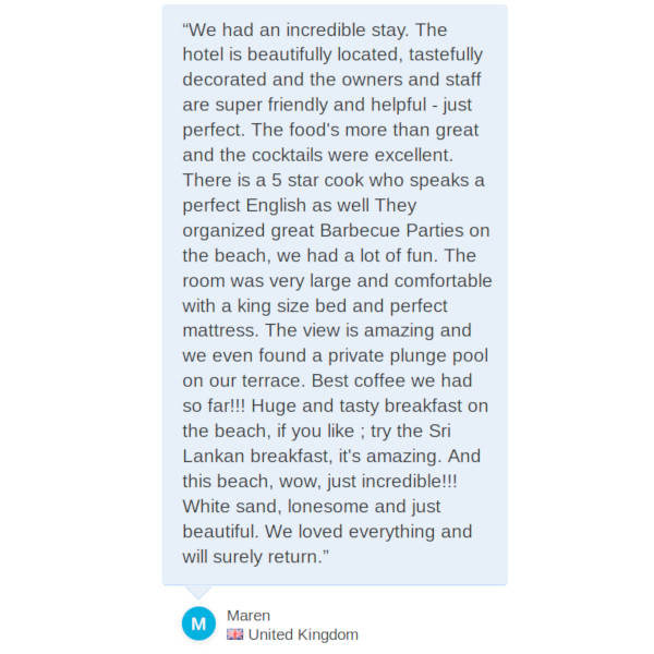 “We had an incredible stay. The hotel is beautifully located, tastefully decorated and the owners and staff are super friendly and helpful - just perfect. The food's more than great and the cocktails were excellent. There is a 5 star cook who speaks a perfect English as well They organized great Barbecue Parties on the beach, we had a lot of fun. The room was very large and comfortable with a king size bed and perfect mattress. The view is amazing and we even found a private plunge pool on our terrace. Best coffee we had so far!!! Huge and tasty breakfast on the beach, if you like ; try the Sri Lankan breakfast, it's amazing. And this beach, wow, just incredible!!! White sand, lonesome and just beautiful. We loved everything and will surely return.”