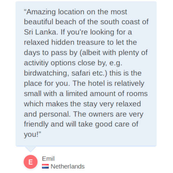 “Amazing location on the most beautiful beach of the south coast of Sri Lanka. If you're looking for a relaxed hidden treasure to let the days to pass by (albeit with plenty of activitiy options close by, e.g. birdwatching, safari etc.) this is the place for you. The hotel is relatively small with a limited amount of rooms which makes the stay very relaxed and personal. The owners are very friendly and will take good care of you!”